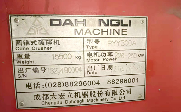 下图为二手大宏立圆锥破设备铭牌,铭牌清晰可以看到 设备型号 PYY300A 设备出厂日期为2014年7月